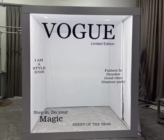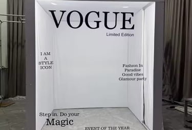 Strike a pose and step into the spotlight with our Vogue Booth setup— where you become the cover star of your very own glamorous photoshoot! Only customised booth included.